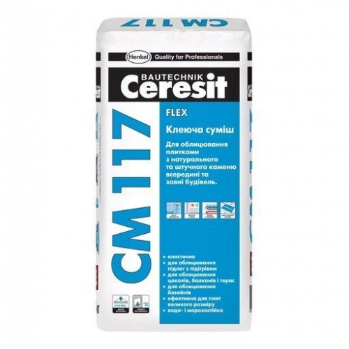 Клей для плитки СМ 117 Ceresit популярный вариант в Киеве, доступный в продаже многих торговых точек. Цена на Церезит СМ 117 средняя, что оправдано универсальностью клеевой смеси.