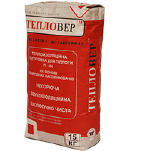 Теплоізоляційна підготовка для підлог «Тепловер» ТМ П-450 - готова до застосування модифікована суха суміш на основі цементу та природних теплоізоляційних заповнювачів – вермікуліту та перліту. Застосовується для утеплення або вирівнювання з ефектом утеплення та звукоізоляції підлог всередині приміщення. Розчин наливається з наступним розрівнюванням на бетонні чи інші підстави. Для надання високих експлуатаційних характеристик поверхня, після висихання, покривається захисним шаром цементної стяжки або керамічної плитки.